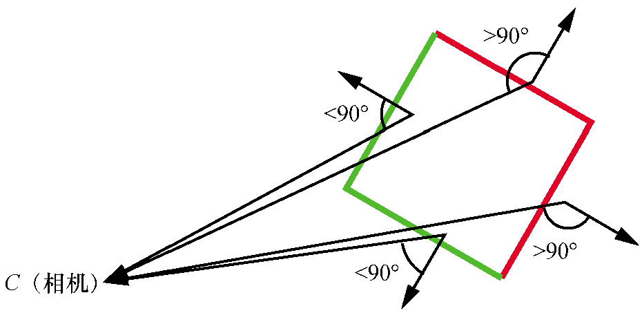}利用三角形顶点到相机的向量和三角形法向量夹角进行分类。